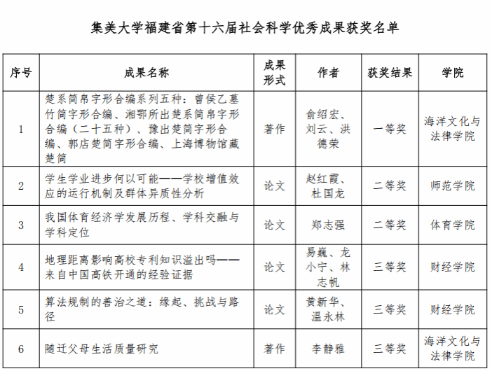 日前,福建省人民政府正式公布《關于頒發福建省第十六屆社會科學優秀成果獎的決定》,我校共有6項成果獲獎,其中一等獎1項、二等獎2項、三等獎3項。獲獎成果涵蓋多個學科領域,呈現研究類型多樣、學術與實踐價值并重的特點,充分體現了我校在社科領域持續深耕、不斷創新的良好態勢。