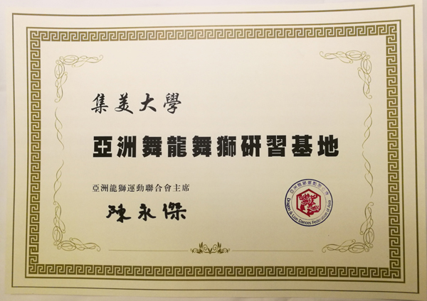 研修班期間,鑒于我校龍獅運(yùn)動近年來在國內(nèi)外比賽中成績優(yōu)秀,教練員培訓(xùn)的師資力量和場館設(shè)施符合亞洲龍獅研習(xí)基地的要求,亞洲龍獅運(yùn)動聯(lián)合會各位執(zhí)委一致同意我校成為“亞洲舞龍舞獅研習(xí)基地”,陳永杰親筆簽名并為我校頒發(fā)了研習(xí)基地證書。