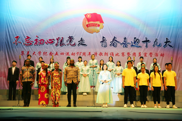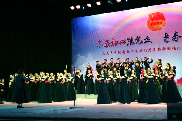 朗誦比賽中,20個學院參賽隊用精心準備的朗誦作品表達了對黨和祖國的熱愛,對歷史的追憶,對校主的緬懷,對青春的歌頌。航海學院的作品《藍色青春的贊歌》,再現了航海人的英雄氣概,他們以夢為馬的青春風采、激情飛揚的赤子之心引發了在場同學的共鳴;文學院的作品《青春中國》,帶我們回憶了戰爭歲月中永不消磨的意志,也為我們重現了“恰同學少年,風華正茂”的奮斗青春;海外教育學院的作品《心中的土地》,通過回祖國尋根的菲律賓華裔小學生和安哥拉留學生的朗誦,表達了祖國是無數華夏子民深愛的土地,是無數游子心中永遠最神圣的地方。