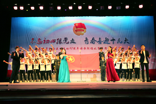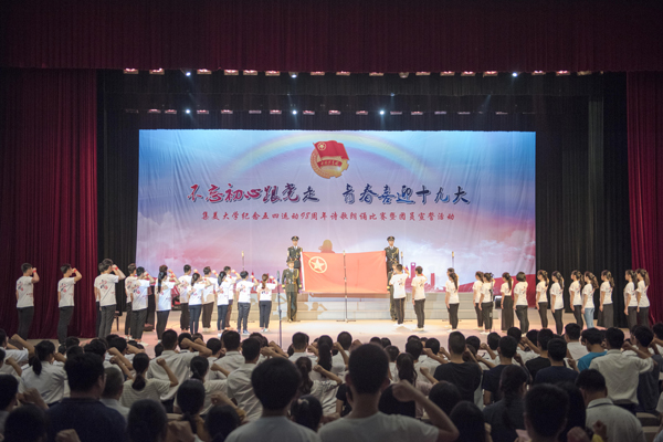 5月4日,我校在誠毅影劇院舉行“不忘初心跟黨走 青春喜迎十九大”紀念五四運動98周年詩歌朗誦比賽暨團員宣誓活動,以紀念“五四”運動98周年,激發團員青年牢記青春使命,凝聚青春正能量,以優異的成績迎接黨的十九大勝利召開。校黨委宣傳部、學生處、校團委部門負責人,各學院黨委副書記、團委書記和1000多名團員代表參加了活動。