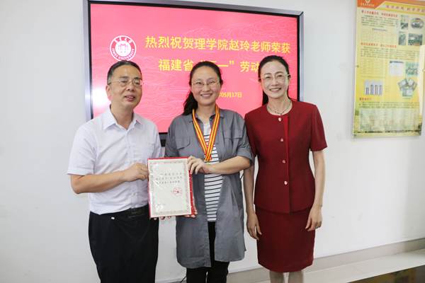 5月17日上午,省總工會副主席郭立新來我校為“省五一勞動獎章”獲得者理學院趙玲老師頒發證書。校黨委副書記、工會主席葉美萍陪同。