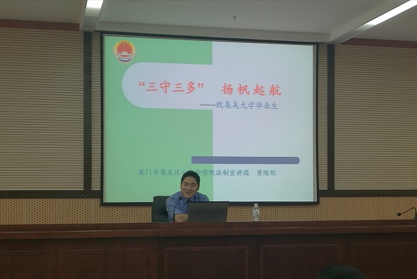 6月6日下午,校紀委邀請集美區檢察院檢察官為我校部分畢業生代表作題為《“三守三多”,揚帆起航》的廉潔教育講座,此次講座是我校面向全校畢業生開展的 “走好社會人生第一步”的廉潔教育系列活動之一。