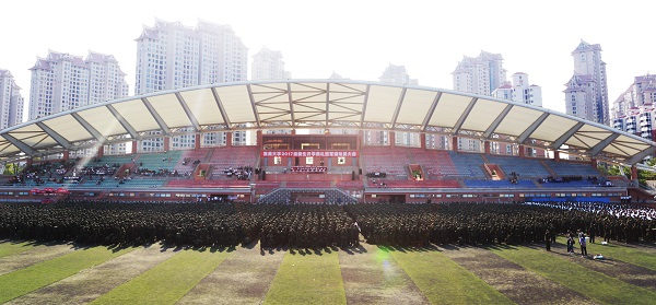 9月15日下午,我校2017級新生齊聚莊重文夫人體育中心參加新生開學典禮暨軍訓動員大會。校領導辜芳昭、李清彪、葉美萍、鄭志謙、黃德棋、于洪亮、曹敏杰,73051部隊部隊長厲振彪大校、政治工作部主任韓波中校,相關部處負責人及各學院領導參加大會。大會由校黨委副書記葉美萍主持。