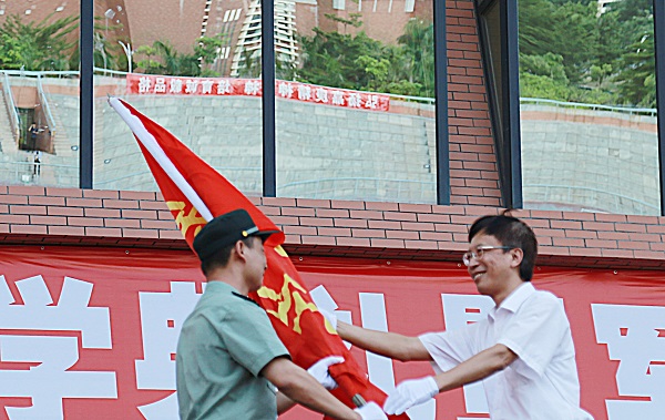 校黨委書記辜芳昭向承訓部隊教官授予集美大學軍訓團團旗。主席臺領導為2017級新生代表佩戴?;铡①浰汀蛾惣胃褡x本》。