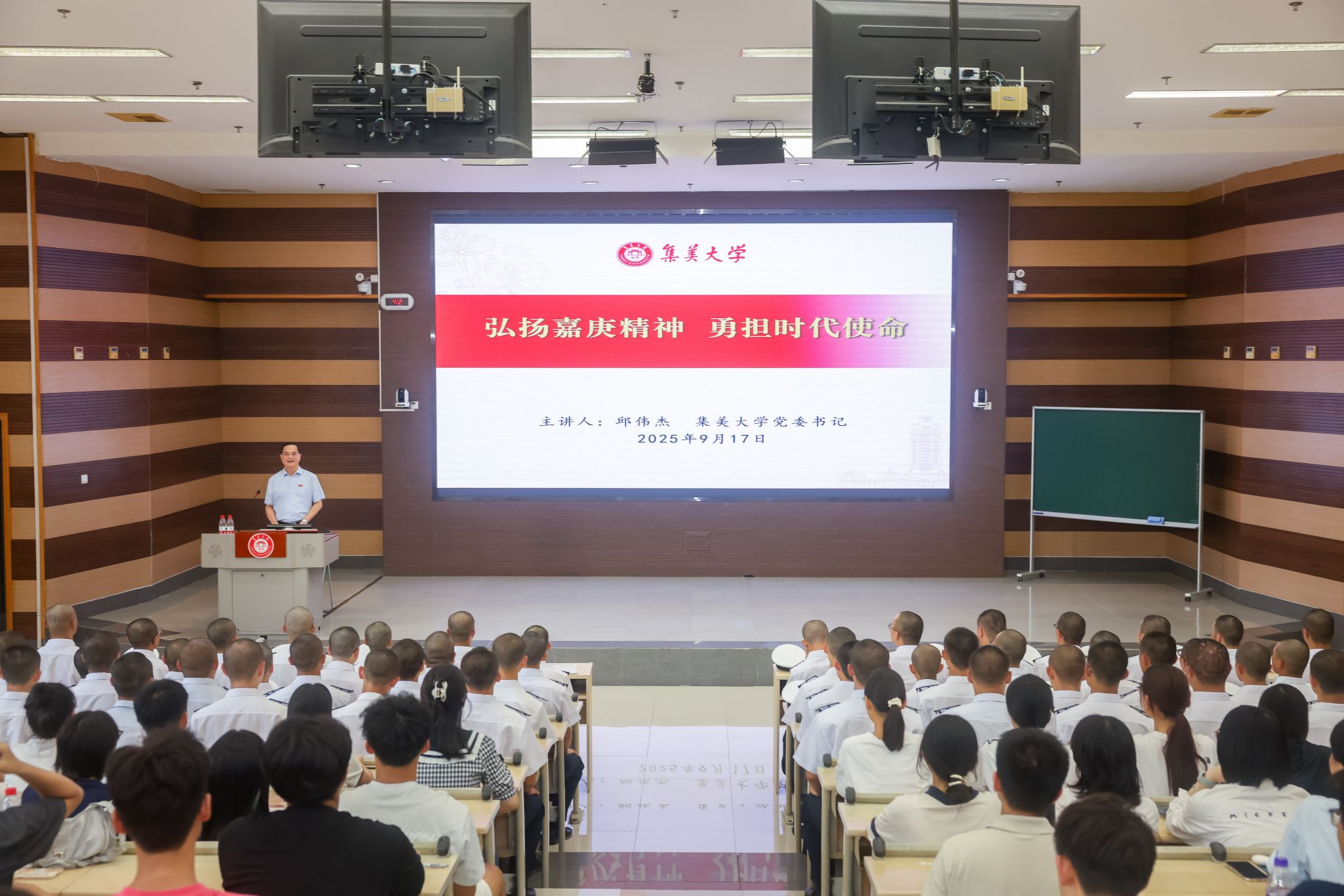 9月17日下午,校黨委書記邱偉杰在建發211以《弘揚嘉庚精神,勇擔時代使命》為題,為2025級新生代表講授“開學第一課”。