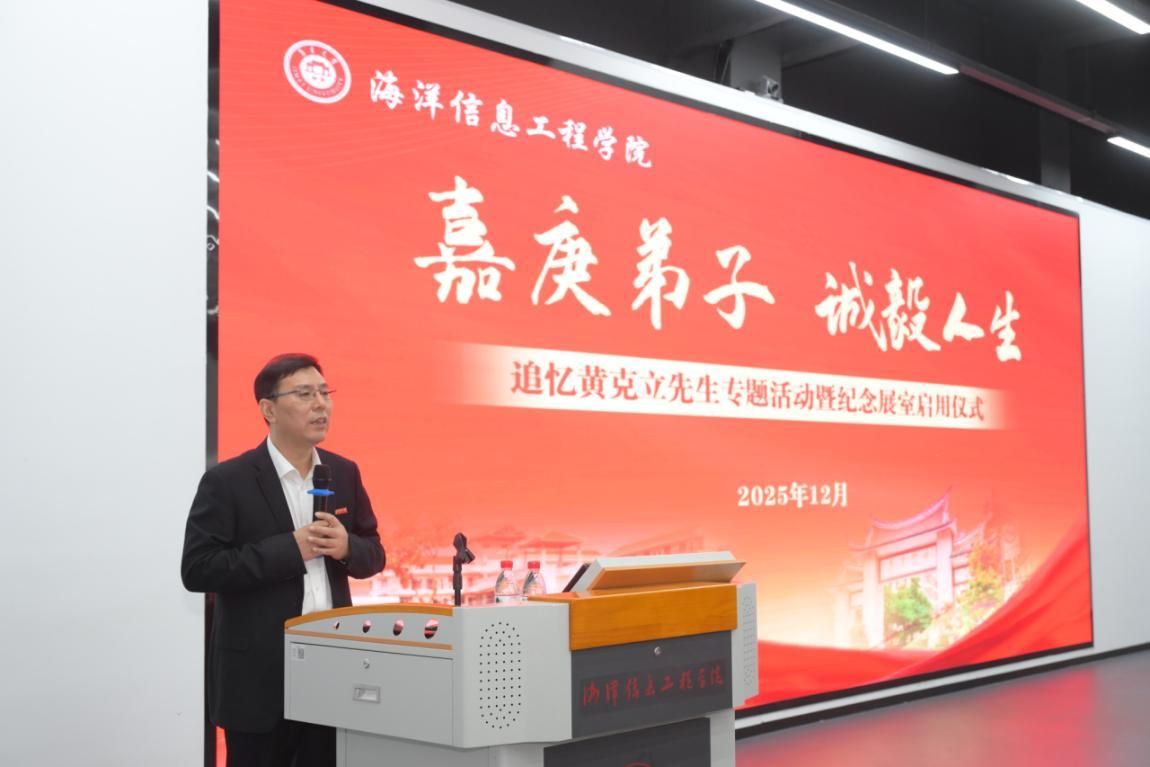 近日,我校舉行追憶黃克立先生專題活動暨紀念展室啟用儀式。校黨委常委、副校長王建,黃克立先生家人代表、金馬傳媒集團董事長黃咸錚,校友總會、校黨委宣傳部、海洋信息工程學(xué)院相關(guān)負責(zé)人及師生代表出席活動。