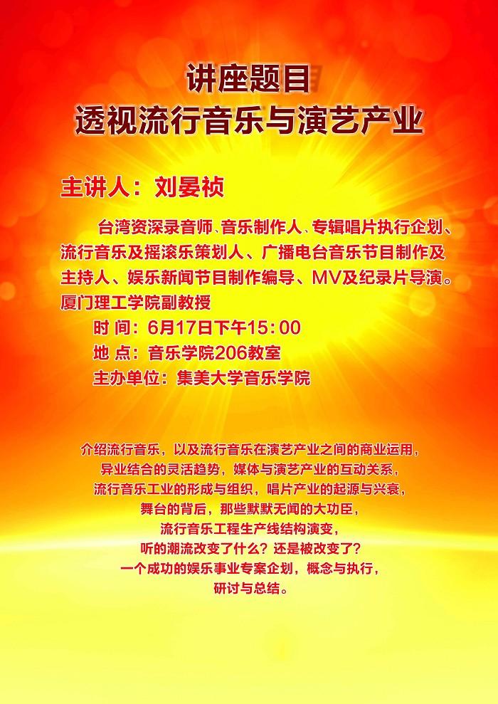 介紹流行音樂,以及流行音樂在演藝產(chǎn)業(yè)之間的商業(yè)運(yùn)用,異業(yè)結(jié)合的靈活趨勢(shì),媒體與演藝產(chǎn)業(yè)的互動(dòng)關(guān)系,流行音樂工業(yè)的形成與組織,唱片產(chǎn)業(yè)的起源與興衰,舞臺(tái)的背后,那些默默無聞的大功臣,流行音樂工程生產(chǎn)線結(jié)構(gòu)演變,聽的潮流改變了什么?還是被改變了?一個(gè)成功的娛樂事業(yè)專案企劃,概念與執(zhí)行,研討與總結(jié)。