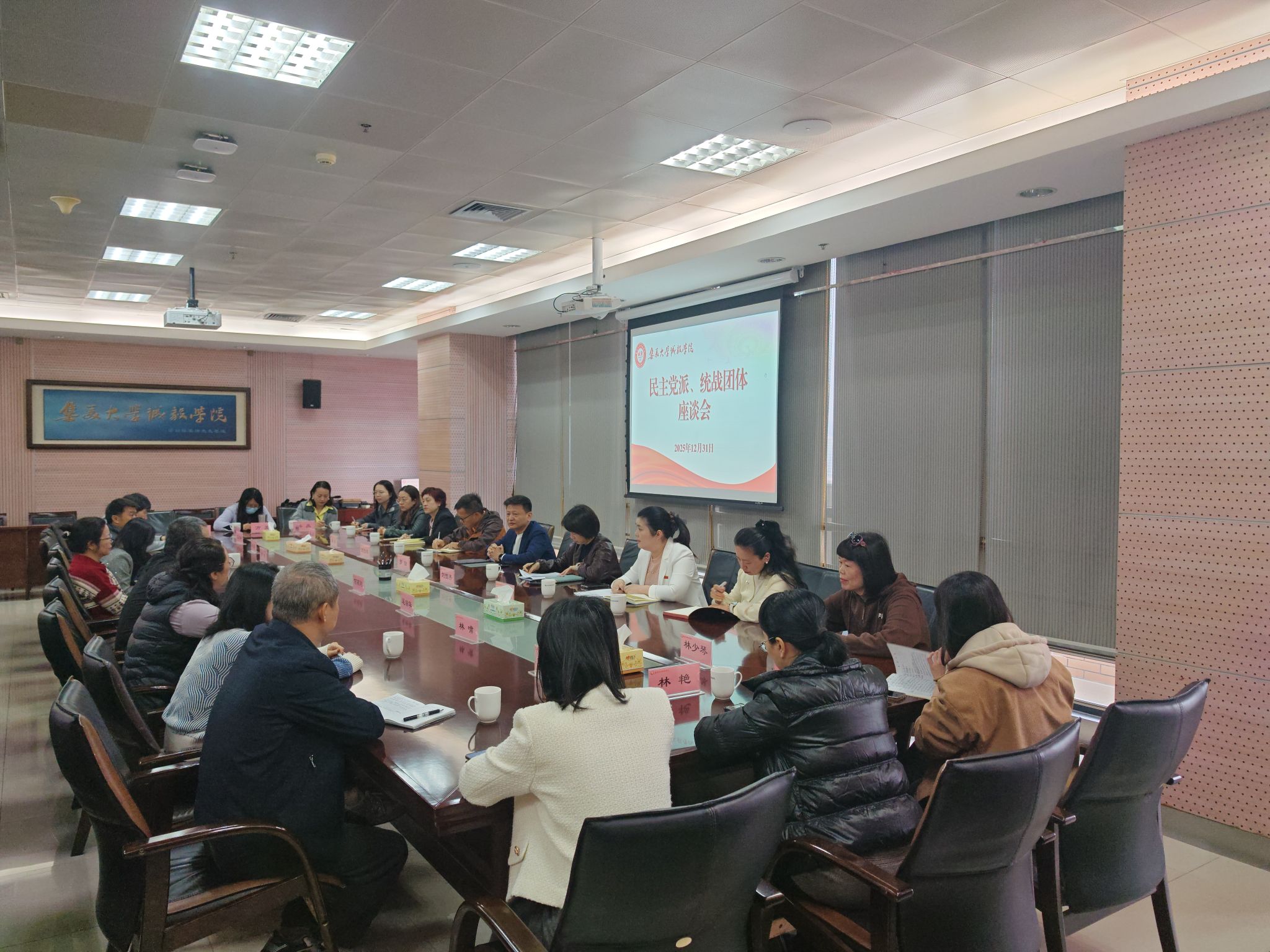 會(huì)上,羅鈁圍繞黨建引領(lǐng)、人才培養(yǎng)、服務(wù)保障、統(tǒng)戰(zhàn)工作四個(gè)維度,從堅(jiān)持學(xué)思踐悟、激發(fā)黨建思政活力、聚焦整改實(shí)效、優(yōu)化專業(yè)布局、夯實(shí)人才隊(duì)伍、做好招生就業(yè)、拓寬育人模式、拓展交流合作、推進(jìn)信息化建設(shè)、改善基礎(chǔ)設(shè)施、優(yōu)化校園環(huán)境以及黨外人士在筑牢隊(duì)伍根基、深耕參政議政、賦能科研教學(xué)等14個(gè)方面通報(bào)了學(xué)院2025年發(fā)展成效。他充分肯定各民主黨派、統(tǒng)戰(zhàn)團(tuán)體成員在教學(xué)、科研、學(xué)科競(jìng)賽等方面為學(xué)院發(fā)展作出的積極貢獻(xiàn),并致以衷心感謝。他強(qiáng)調(diào),各民主黨派、統(tǒng)戰(zhàn)團(tuán)體成員要深入學(xué)習(xí)貫徹黨的二十屆四中全會(huì)精神,深入領(lǐng)會(huì)中共中央的戰(zhàn)略部署,始終同中國(guó)共產(chǎn)黨想在一起、站在一起、干在一起;要發(fā)揮教學(xué)科研優(yōu)勢(shì),主動(dòng)擔(dān)當(dāng)作為,為學(xué)院“十五五”規(guī)劃編制建言獻(xiàn)策;要凝聚力量,立足自身特長(zhǎng),在助力人才培養(yǎng),特別在畢業(yè)生就業(yè)工作中展現(xiàn)新?lián)?dāng)、實(shí)現(xiàn)新作為。