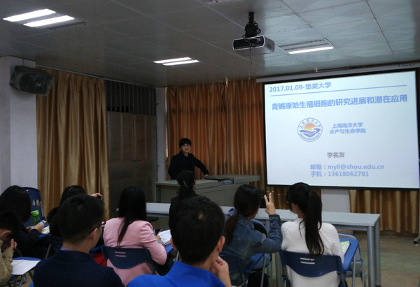1月9日上午,上海海洋大學水產與生命學院魚類干細胞實驗室李名友研究員應邀來水產學院進行學術交流,并作了題為“青鳉原始生殖細胞的研究進展和潛在應用”的學術報告。學院遺傳育種及生物基礎等研究團隊的師生聆聽了報告。