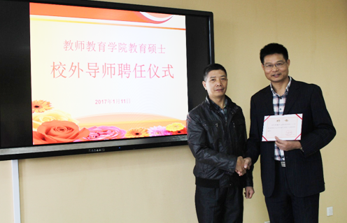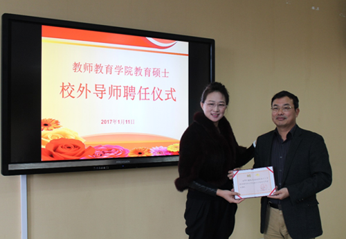 1月11日上午,教師教育學院舉行教育碩士校外實踐指導教師聘任儀式,學院領導、校內與校外教育碩士指導教師、全體教育碩士參加了會議。