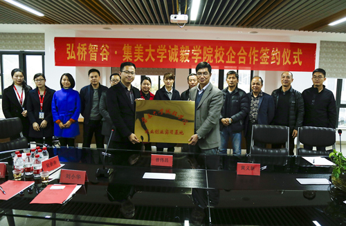 簽約儀式座談會上,弘橋智谷電商產業園副總裁曾偉昌詳細介紹了產業園園區概況、企業資質、人才需求及校企合作前景等情況,并期待學院能輸送更多的畢業生到園區實習和就業。黃義新詳細介紹了學院的辦學特色、人才培養模式、實踐教學現狀等基本情況,希望在人才培養、專業建設等方面能與企業有更深一步的合作。雙方就如何開展校企合作、實踐基地建設、學生實習就業等相關事宜進行了深入交流,希望通過校企共建就業創業實習基地,整合運用生產實踐及教育資源,發揮各自優勢,取得互惠共贏的成果。黃義新和曾偉昌代表雙方簽訂了就業創業實習基地協議并授牌。