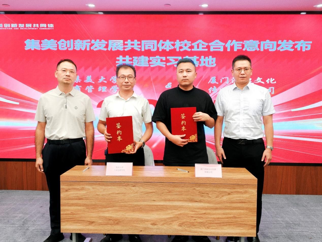 在集美區人力資源發展中心、校企代表以及集美創新發展共同體項目組的共同見證下,張儀華與廈門浪起文化科技有限公司合伙人郭銀山分別代表雙方單位簽署共建實習基地協議。本次簽約儀式的舉行,標志著校企合作從“意向”走向落地。校企雙方將通過聯合共建實習基地,為學生提供真實企業實踐場景,助力學生在沉浸式實踐中,積累實操經驗,切實提升實踐作戰能力與職場適配度。
