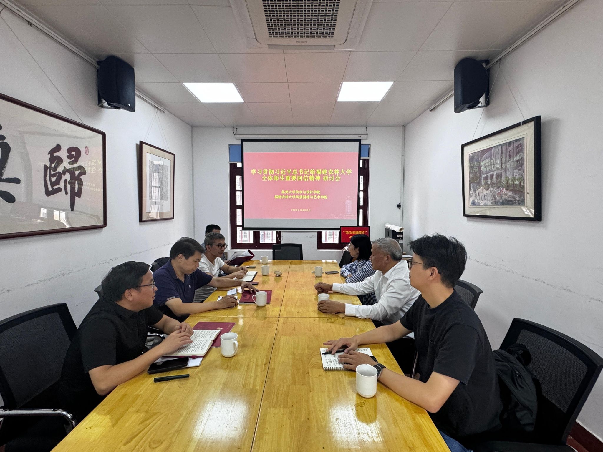 10月23日上午,福建農(nóng)林大學(xué)風(fēng)景園林與藝術(shù)學(xué)院黨委書記陳祖建一行來訪美術(shù)與設(shè)計學(xué)院,雙方圍繞學(xué)習(xí)貫徹習(xí)近平總書記給福建農(nóng)林大學(xué)全體師生重要回信精神開展專題交流研討。學(xué)院黨委書記王高堯、院長汪曉東及教師代表參加座談。