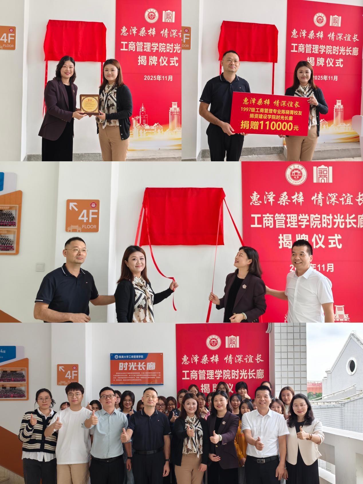 11月18日,工商管理學院“時光長廊”揭牌儀式舉行。1997級校友陳曉菁,院黨委書記陳娟、黨委副書記董欣勝、副院長吳江秋及師生代表共同出席。
