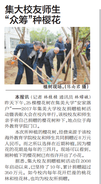 廈門日報:《集大校友師生“眾籌”種櫻花 》www.xmnn.cn/dzbk/xmrb/20170309/201703/t20170309_5051806.htm