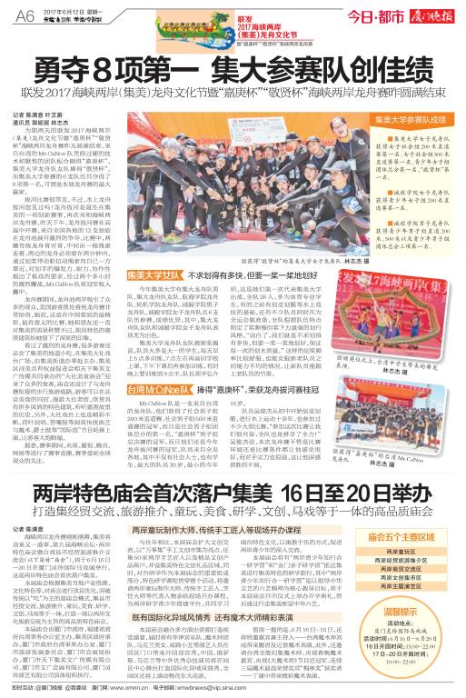 廈門日報:《集美大學龍舟女隊“贏得大滿貫”》http://www.xmnn.cn/dzbk/xmrb/20170612/201706/t20170612_5081466.htm