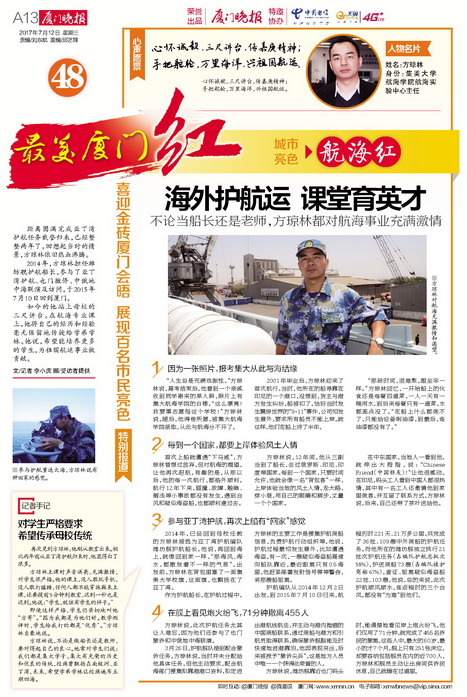 2014年,已經回到母校任教的方瓊林被選為亞丁灣護航編隊濰坊艦護航船長。他說,再回到海上,就像回到家一樣,“那海風、海水,都散發著不一樣的氣息”。出發前,方瓊林在背包里塞了一面集美大學校旗,這面旗,也飄揚在了亞丁灣。
