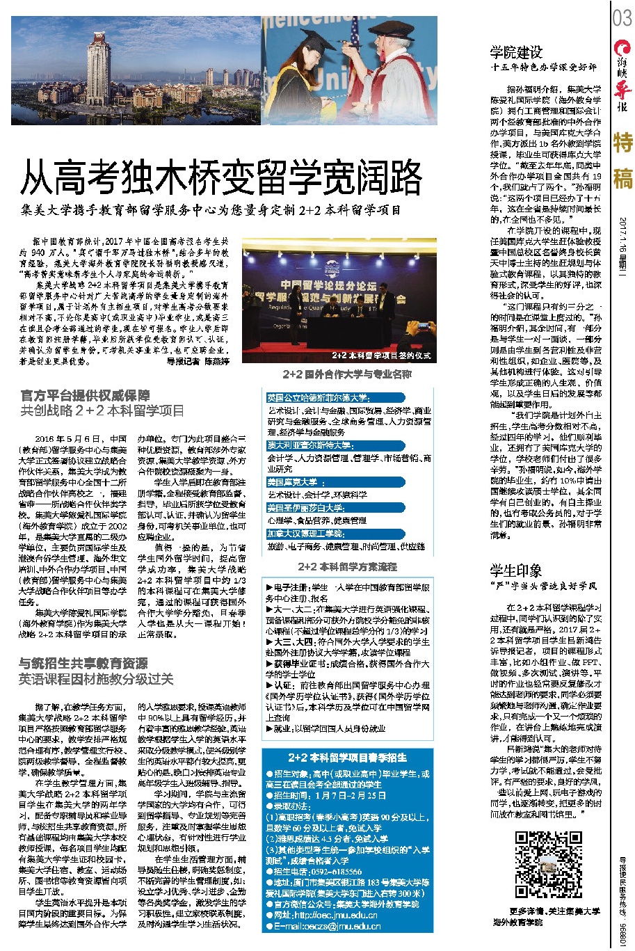 集美大學戰略2+2本科留學項目是集美大學攜手教育部留學服務中心針對廣大苦戰高考的學生量身定制的海外留學項目,屬于計劃外自主招生項目,對學生高考分數要求相對不高,不論你是高中(或職業高中)畢業學生,或是高三在讀且會考全部通過的學生,現在皆可報名。學生入學后即在教育部注冊學籍,畢業后所獲學位受教育部認可、認證,并確認為留學生身份,可考機關事業單位,也可應聘企業,若是創業更具優勢。