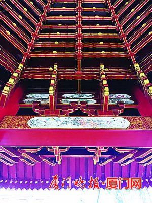 據介紹,軍樂亭重建用材都非常好,八根柱子原來是石柱,重建選用了珍貴的菠蘿格木,在施工工藝上采用了傳統閩南建筑工藝。亭內的圖畫,延續陳嘉庚先生教育后代的理念,選用了二十四孝圖、花鳥圖。
