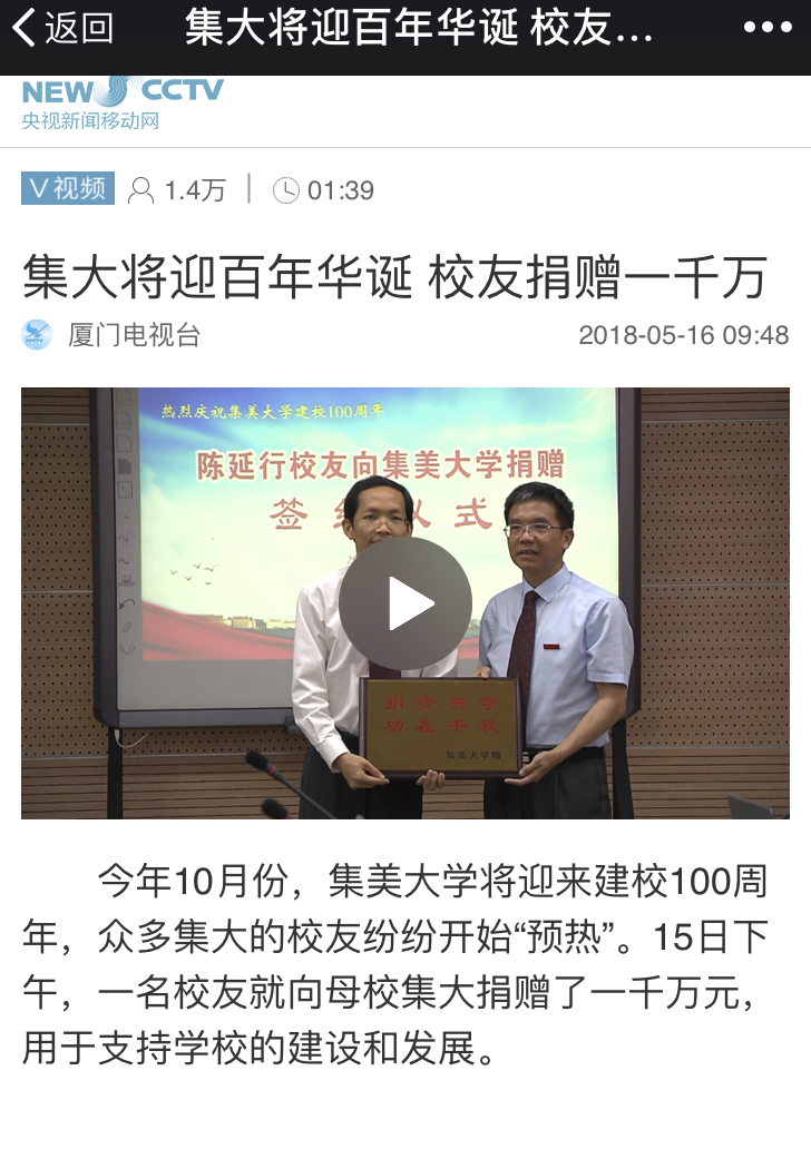 今年10月份,集美大學將迎來建校100周年,眾多集大的校友紛紛開始“預熱”。15日下午,一名校友就向母校集大捐贈一千萬元,用于支持學校的建設和發展。