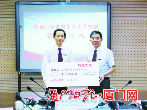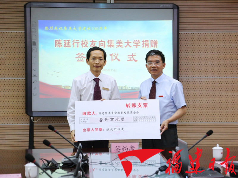 昨日下午,集美大學校友陳延行向母校捐贈1000萬元,用于支持學校的建設與發展。據悉,今年10月,集大將迎來建校100周年,這是該校百年校慶籌備工作啟動以來收到的第一筆大額國內校友捐贈。