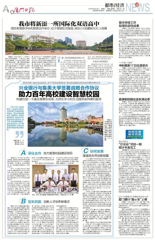 經過多年的發展,興業銀行已成為國內少數具有銀行核心系統自主研發能力的銀行,也是目前國內對外輸出核心系統技術最多的商業銀行。據悉,接下來,興業銀行將采用以移動互聯網為載體、線上線下互動的智慧金融平臺,為集美大學構建校園一卡通及繳費系統等一系列智慧校園建設項目,為廣大師生的學習和生活提供各種便利服務。