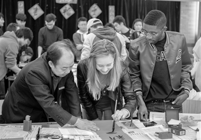 留學生在書法家指導下學寫春聯。唐業威 吳連平 攝