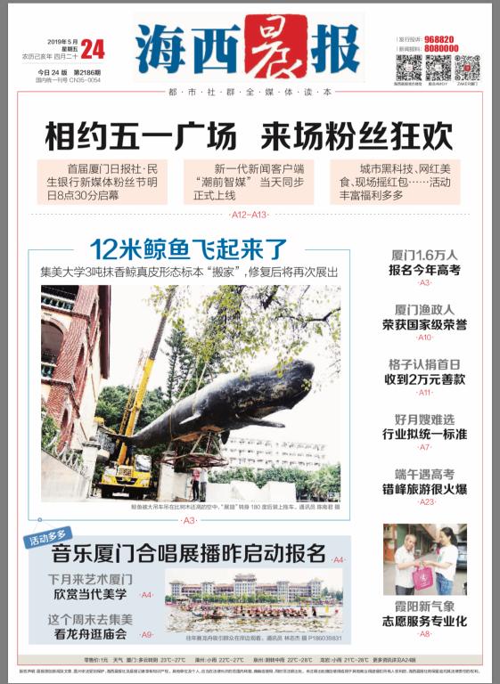 海西晨報:《12米鯨魚飛起來了 集美大學3噸抹香鯨真皮形態標本“搬家”,修復后將再次展出》