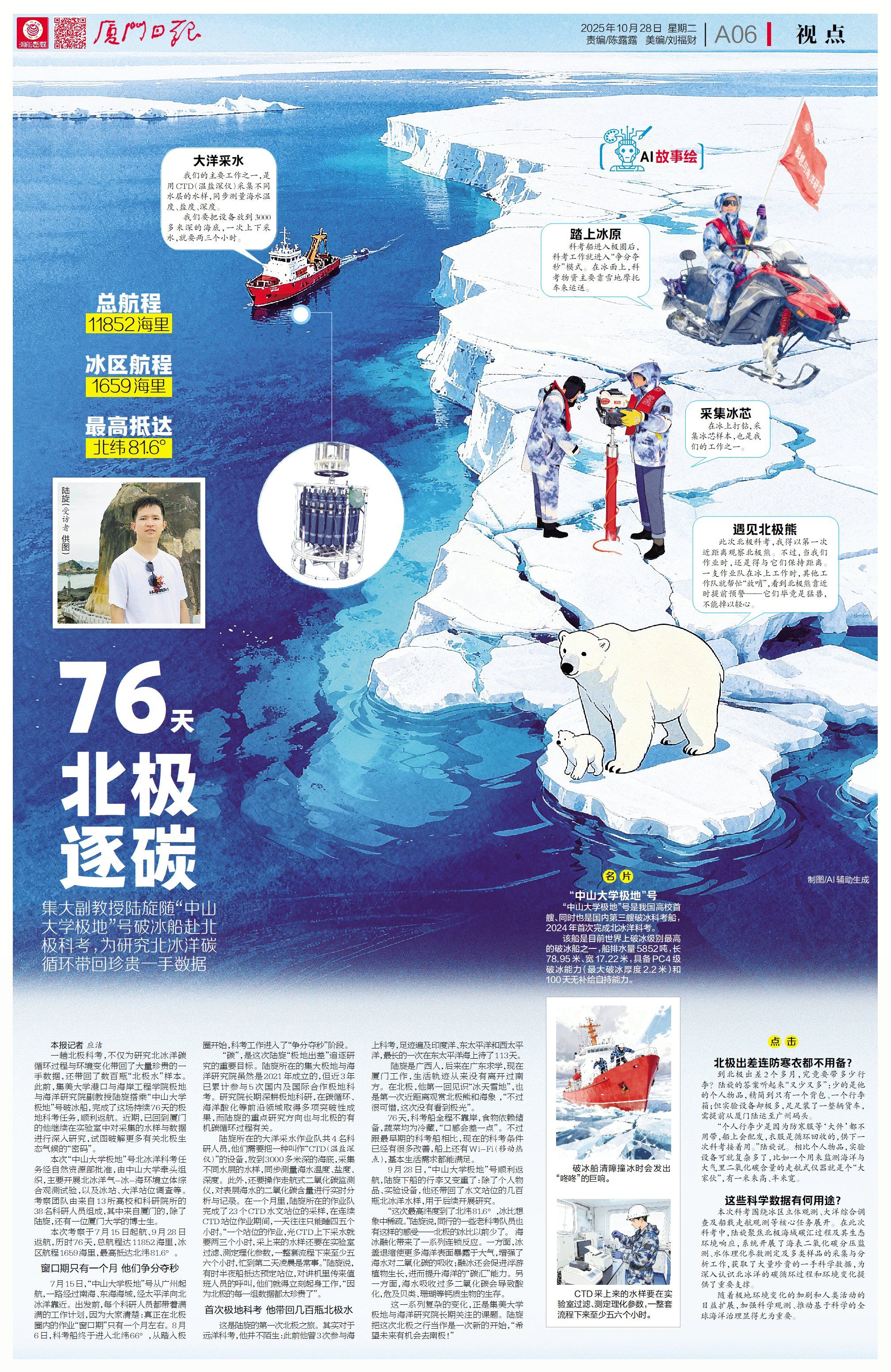 本次“中山大學極地”號北冰洋科考任務經自然資源部批準,由中山大學牽頭組織,主要開展北冰洋氣-冰-海環境立體綜合觀測試驗,以及冰站、大洋站位調查等。考察團隊由來自13所高校和科研院所的38名科研人員組成,其中來自廈門的,除了陸旋,還有一位廈門大學的博士生。