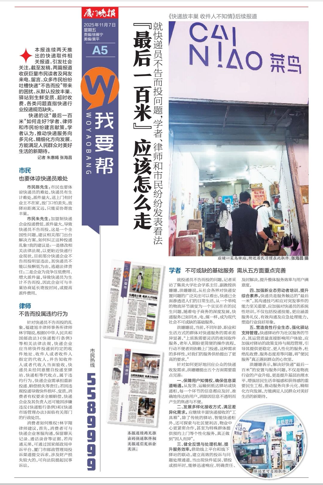 本報連續兩天推出的快遞取件相關報道,引發社會關注。截至發稿,兩篇報道收獲巨量市民讀者及網友來電、留言,眾多市民紛紛吐槽快遞“不告而投”帶來的困擾,從默認投放豐巢、驛站到生鮮變質、超時收費,各類問題直指快遞行業投遞規范缺失。